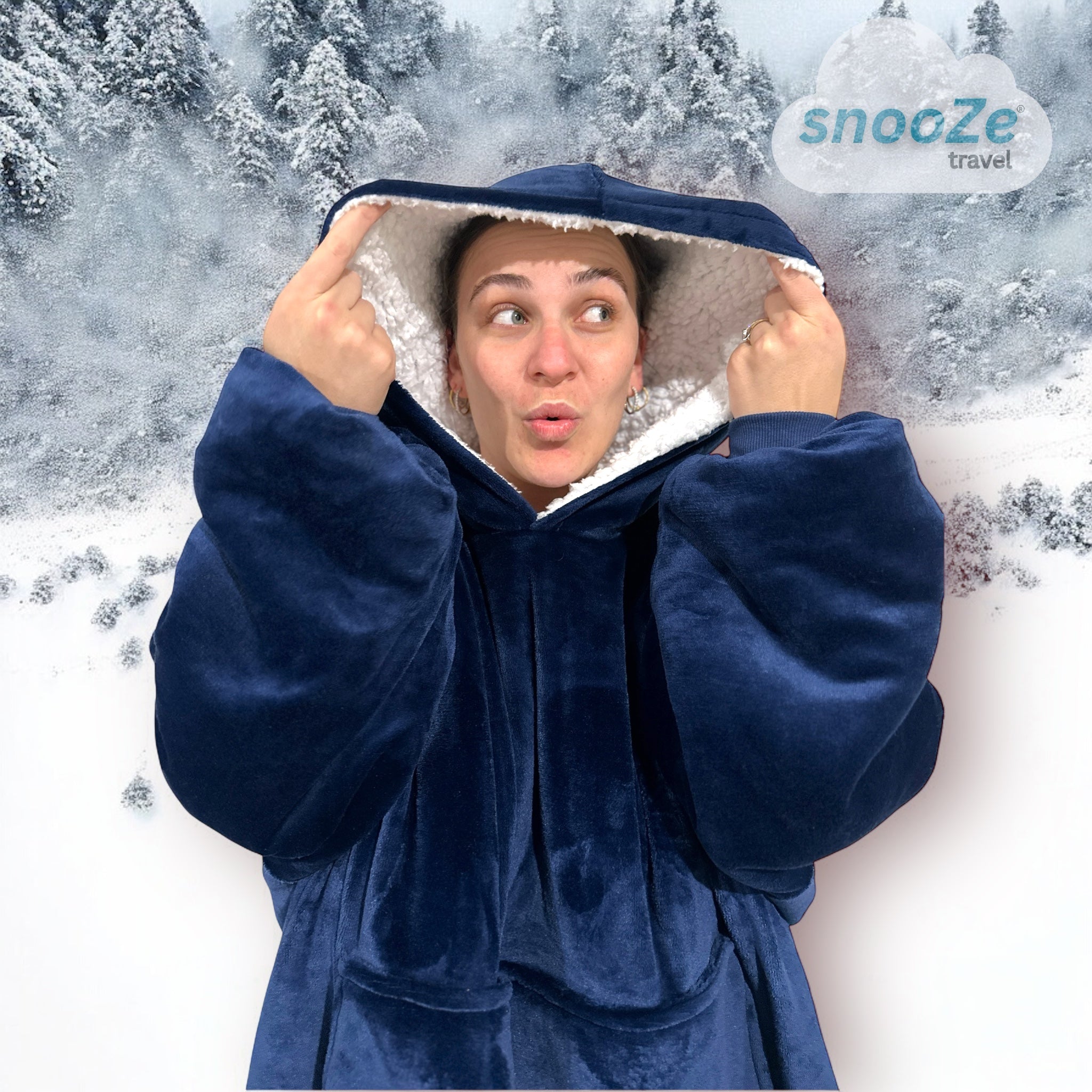 The SnooZie is your ultimate oversized hoodie blanket – now 10cm longer for extra coziness and designed to travel with you. Made with cloud-soft flannel on the outside and ultra-warm sherpa fleece on the inside, it's perfect for lounging, flying, camping, or chilly mornings. Folds into a plush pillow, slides over luggage handles, and features big cozy pockets for your essentials. One size fits most.